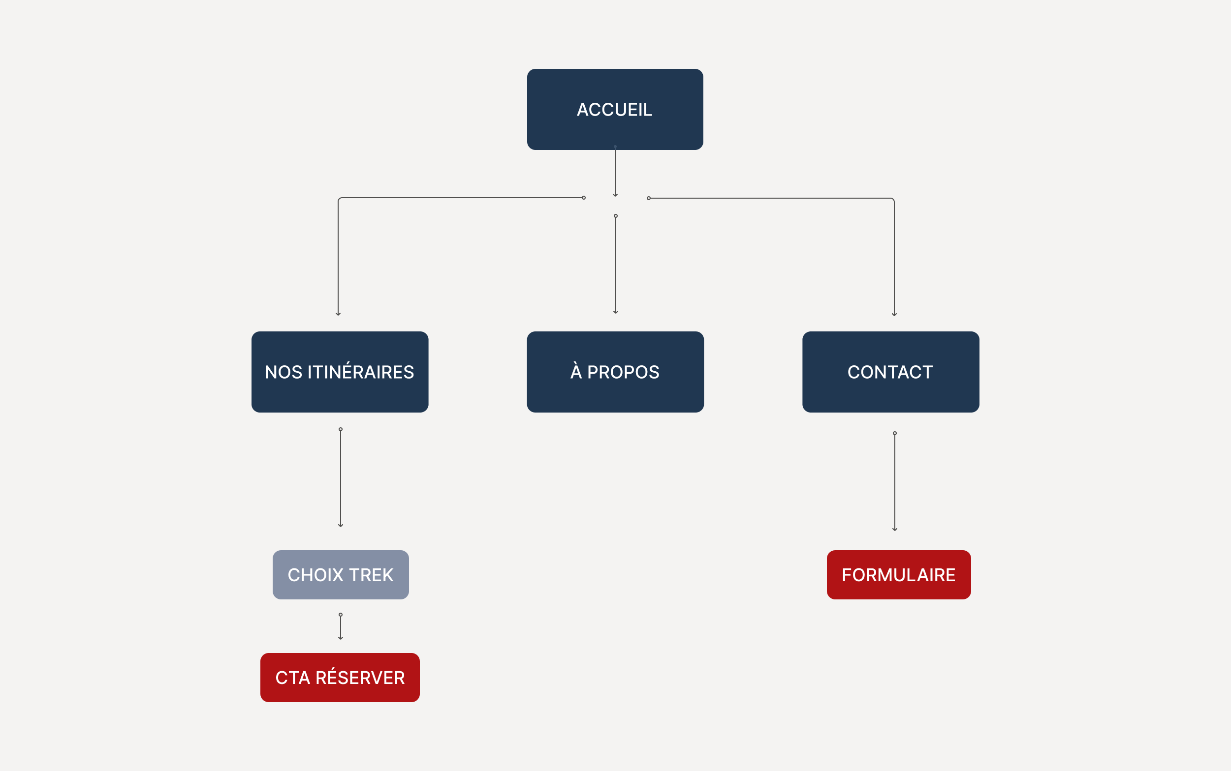 Création d’une arborescence claire et hiérarchisée : de la découverte des treks → à la page détaillée → à la réservation.